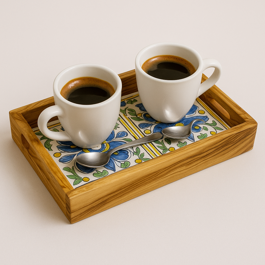 Ogni bundle contiene una macchina da caffè Ariete Vintage e accessori artigianali in legno d’ulivo, come vassoi e zuccheriere, realizzati a mano in Sicilia.